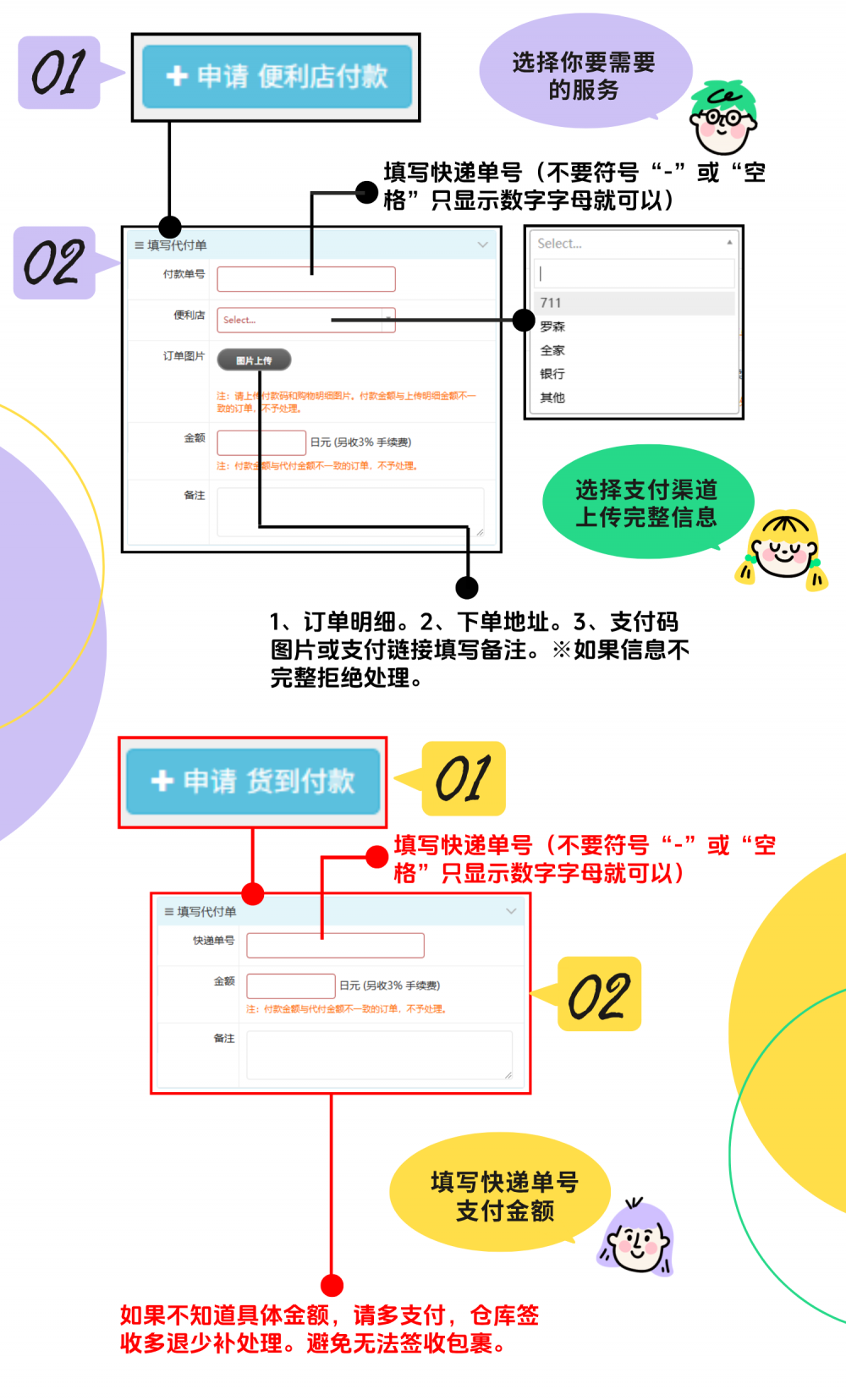 2、便利店付款:申请便利店付款,填写付款单号,便利店店铺,上传订单付款码与金额、购物明细图片(多张图可)。如支付金额与明细金额不一致,不予处理。如订单超时,有买家承担。